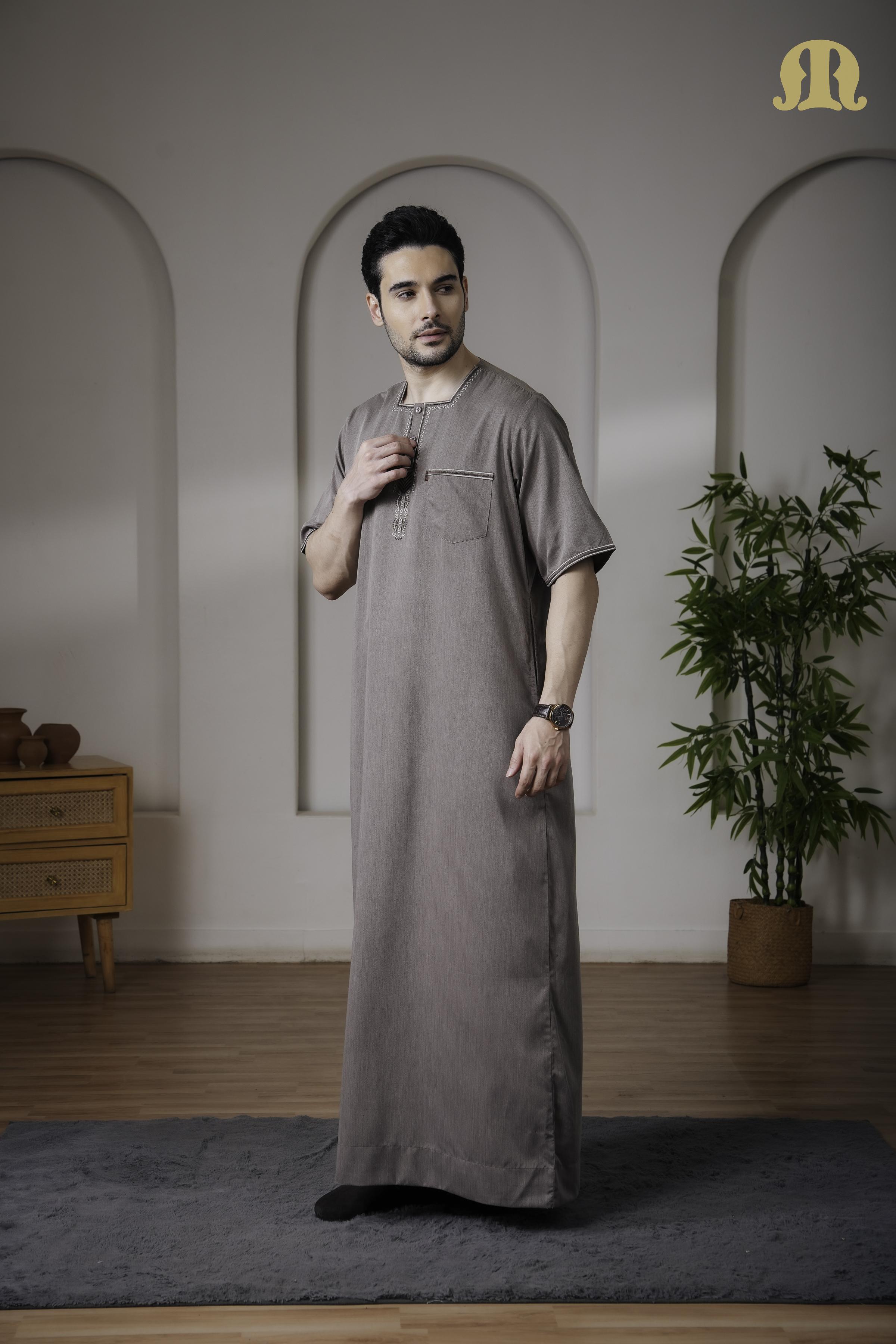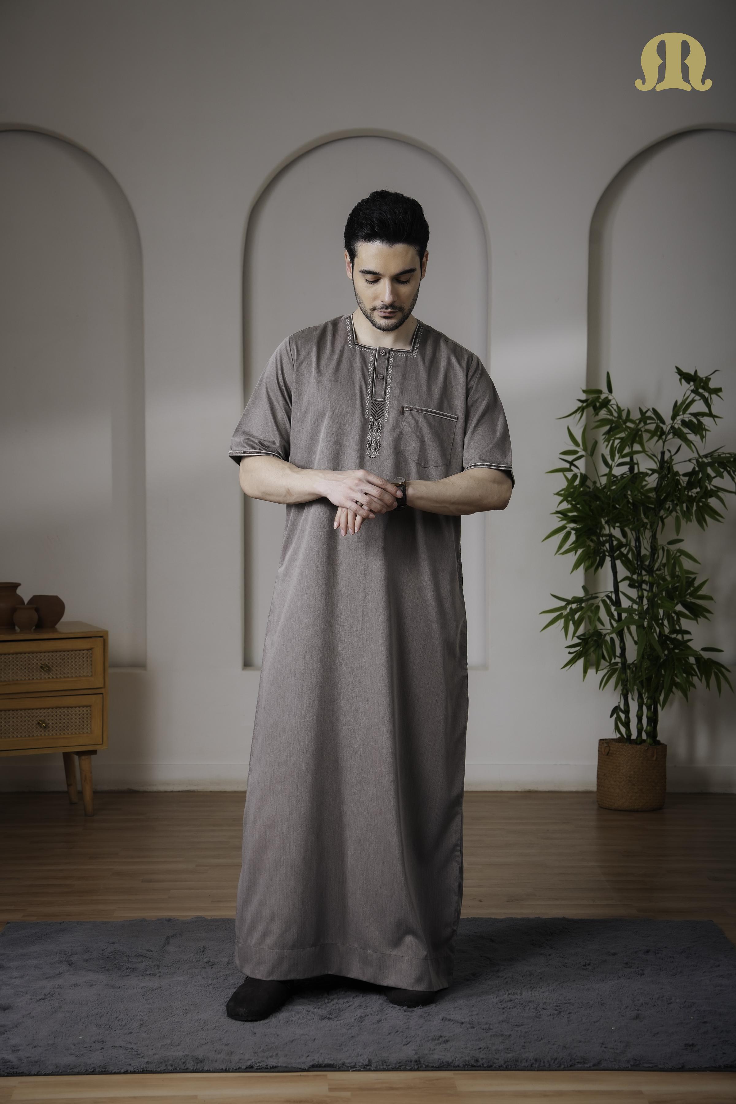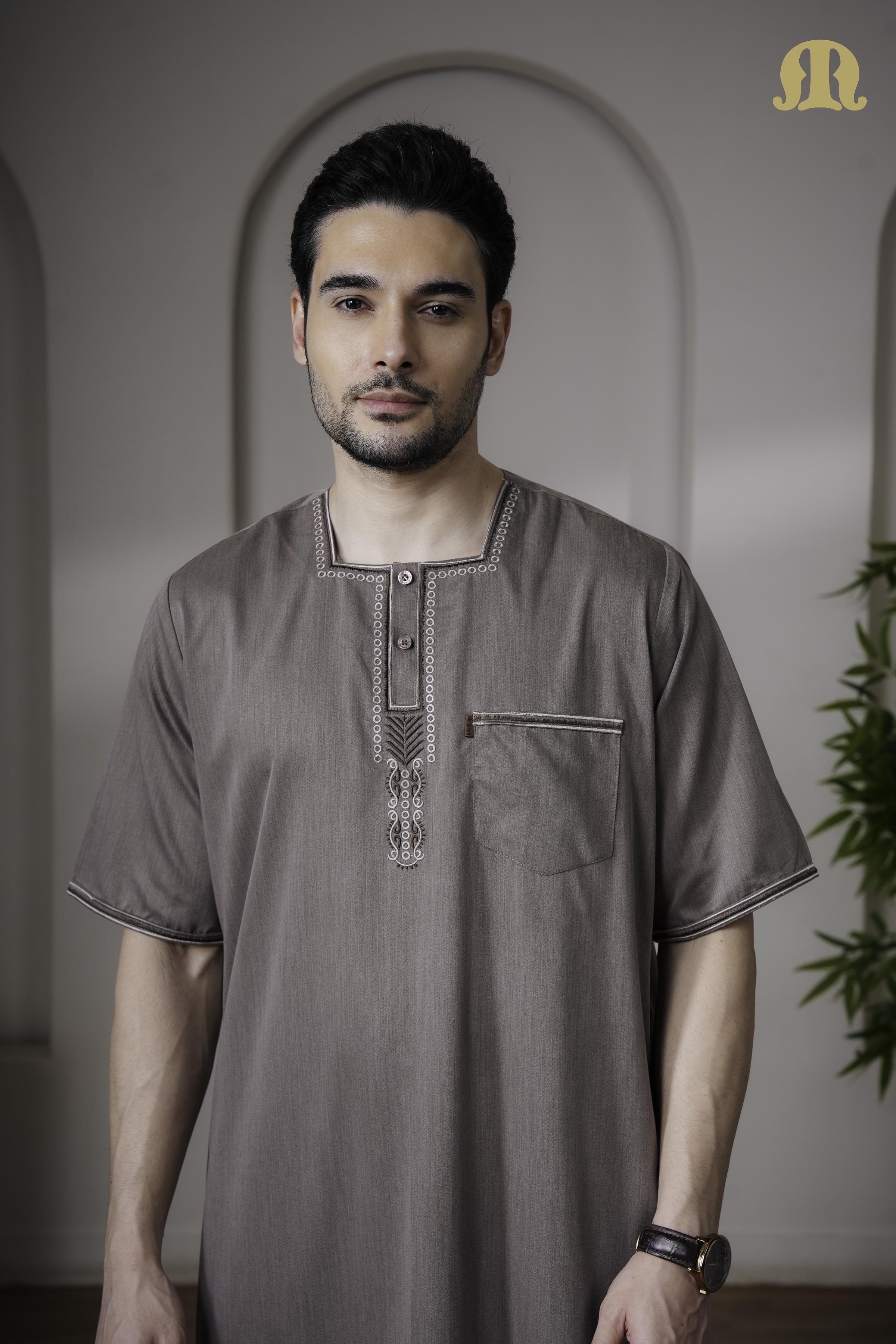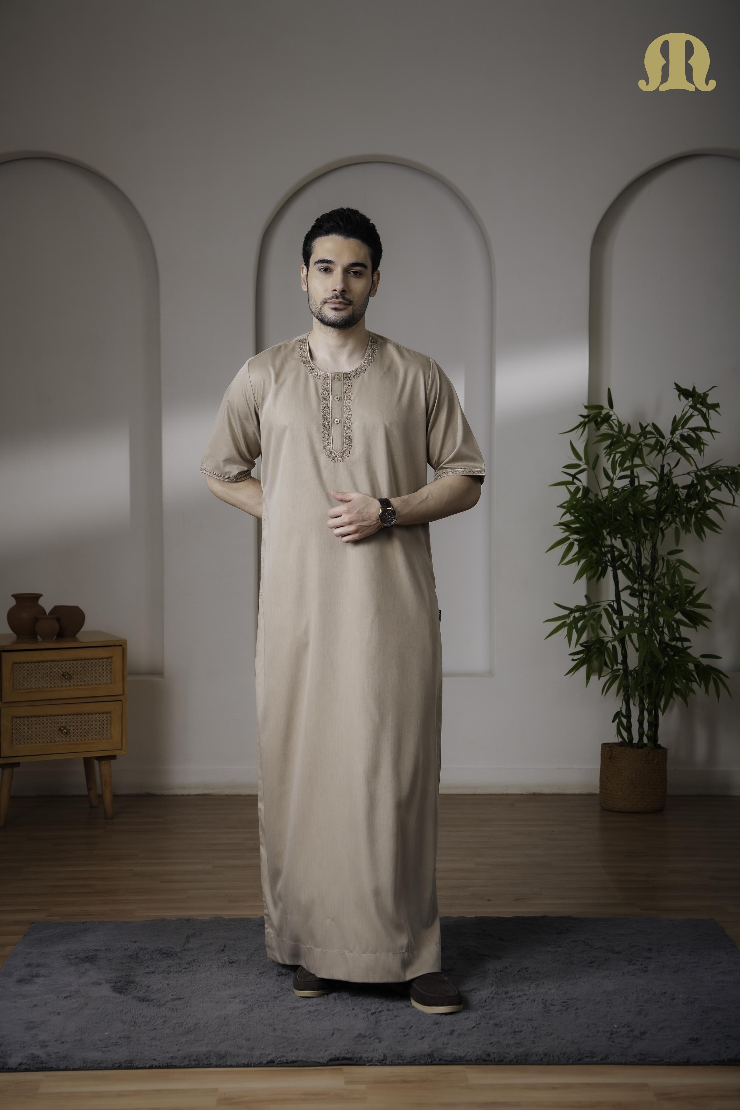 Designed for comfort with refined detailing, this Beige Andak Half Sleeve Thobe offers a perfect balance of practicality and traditional elegance. Its clean, streamlined silhouette ensures ease of movement, making it ideal for everyday wear in all climates. Crafted from premium Poly Viscose fabric, the thobe combines the breathability of cotton with the durability and wrinkle resistance of polyester. The result is a lightweight, easy-to-maintain garment that stays comfortable and presentable throughout the day. The design is elevated by an embroidered, adding a touch of sophistication, while embroidered sleeves enhance the overall look with subtle craftsmanship. The half sleeves provide a relaxed, contemporary feel without compromising modesty or style.