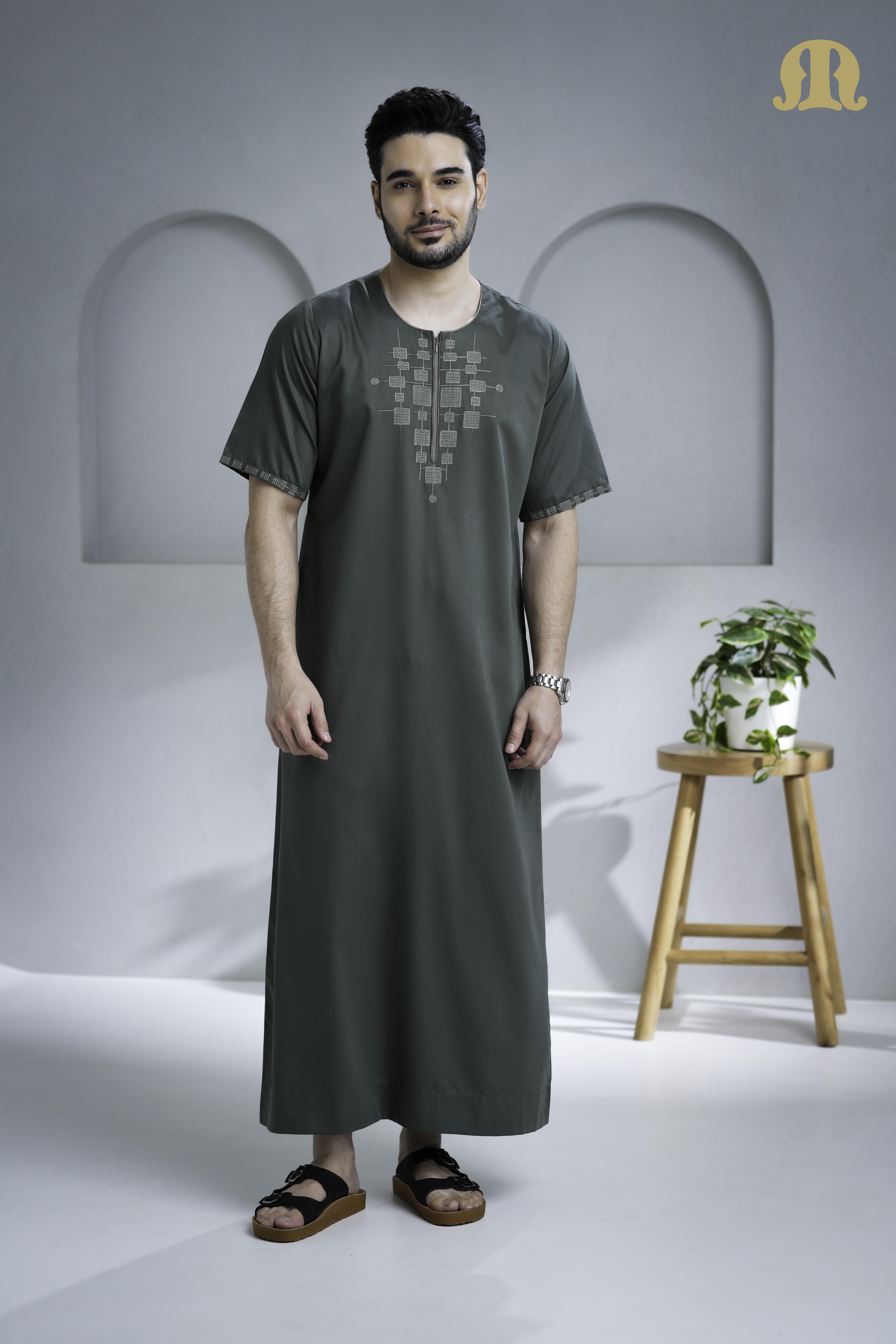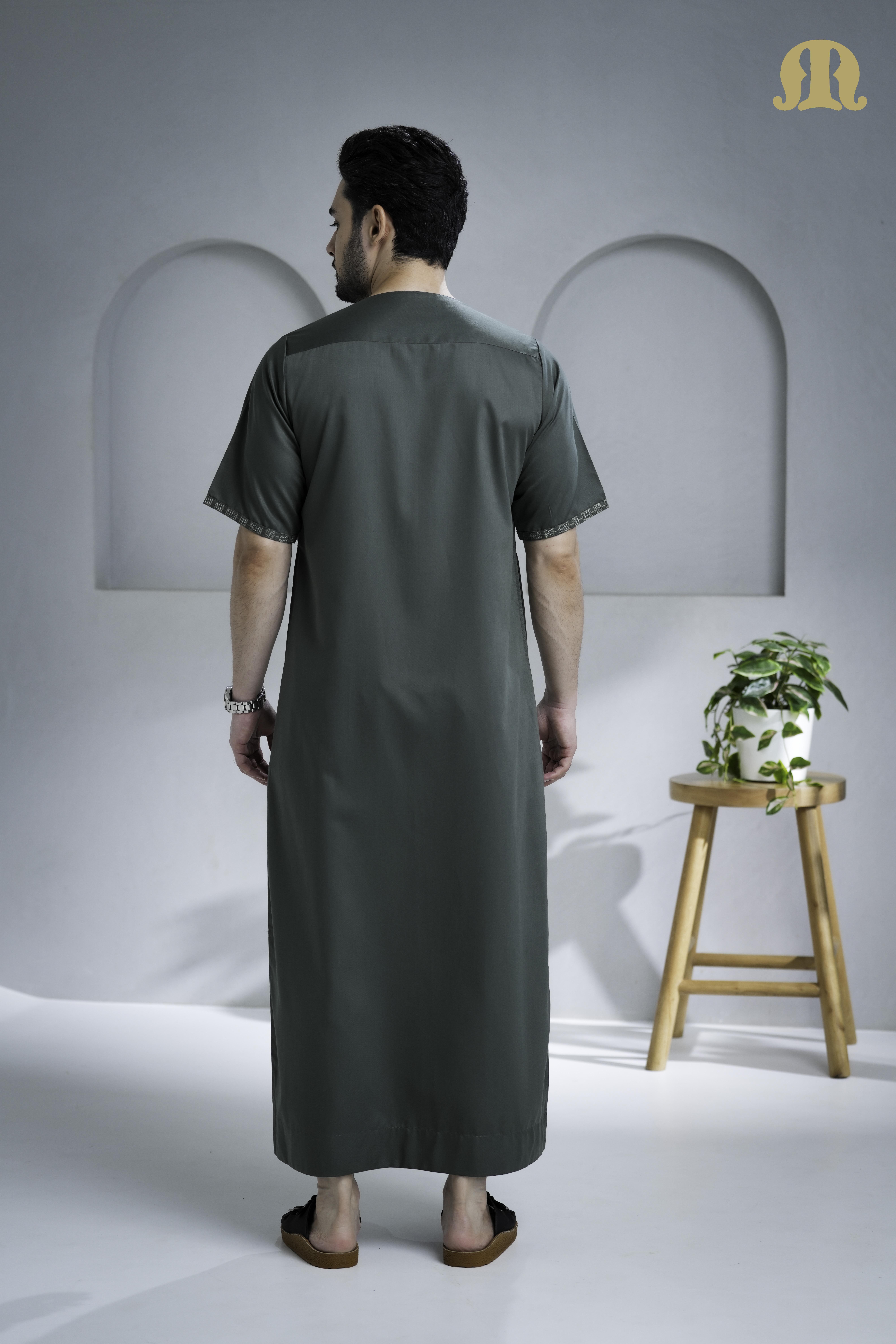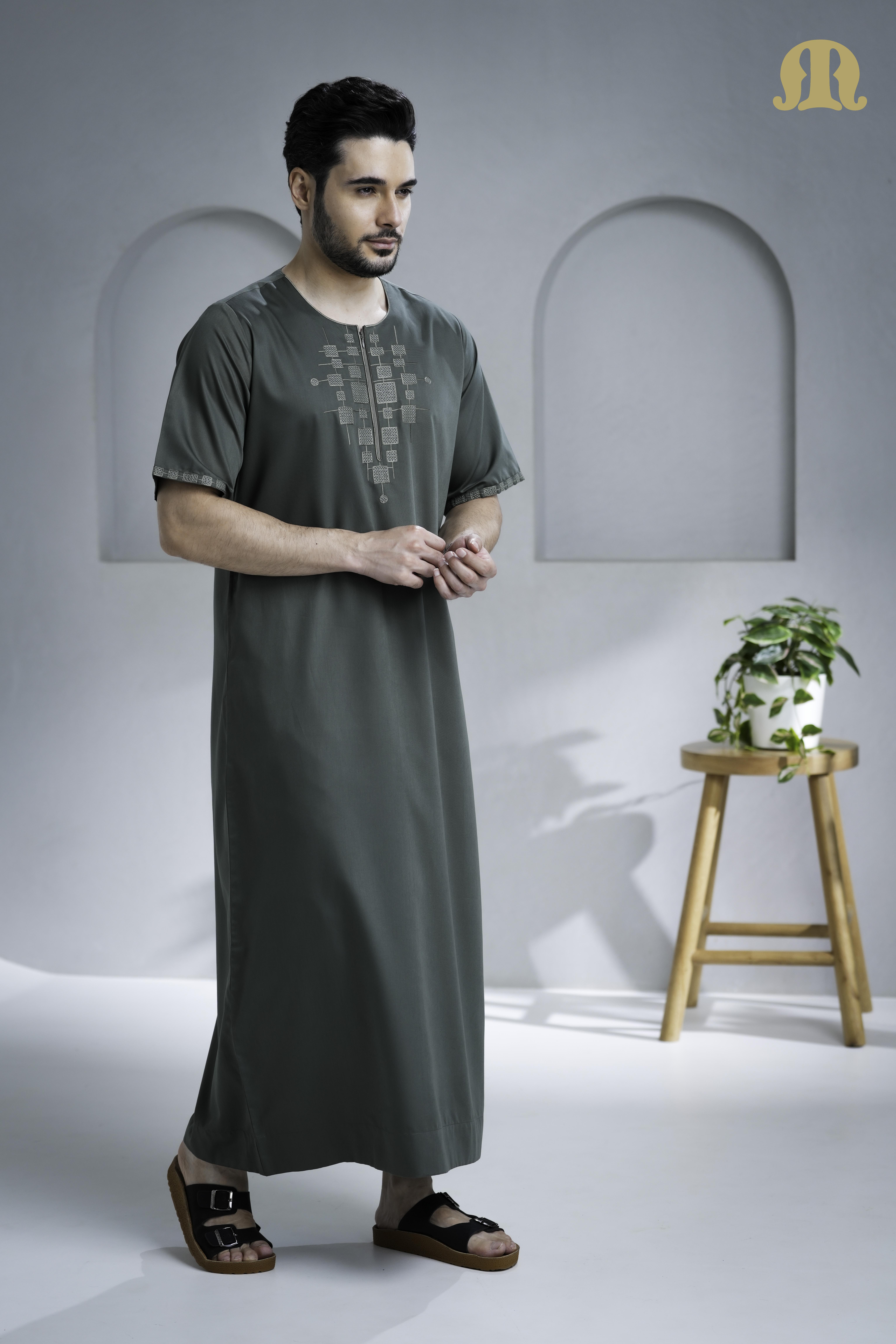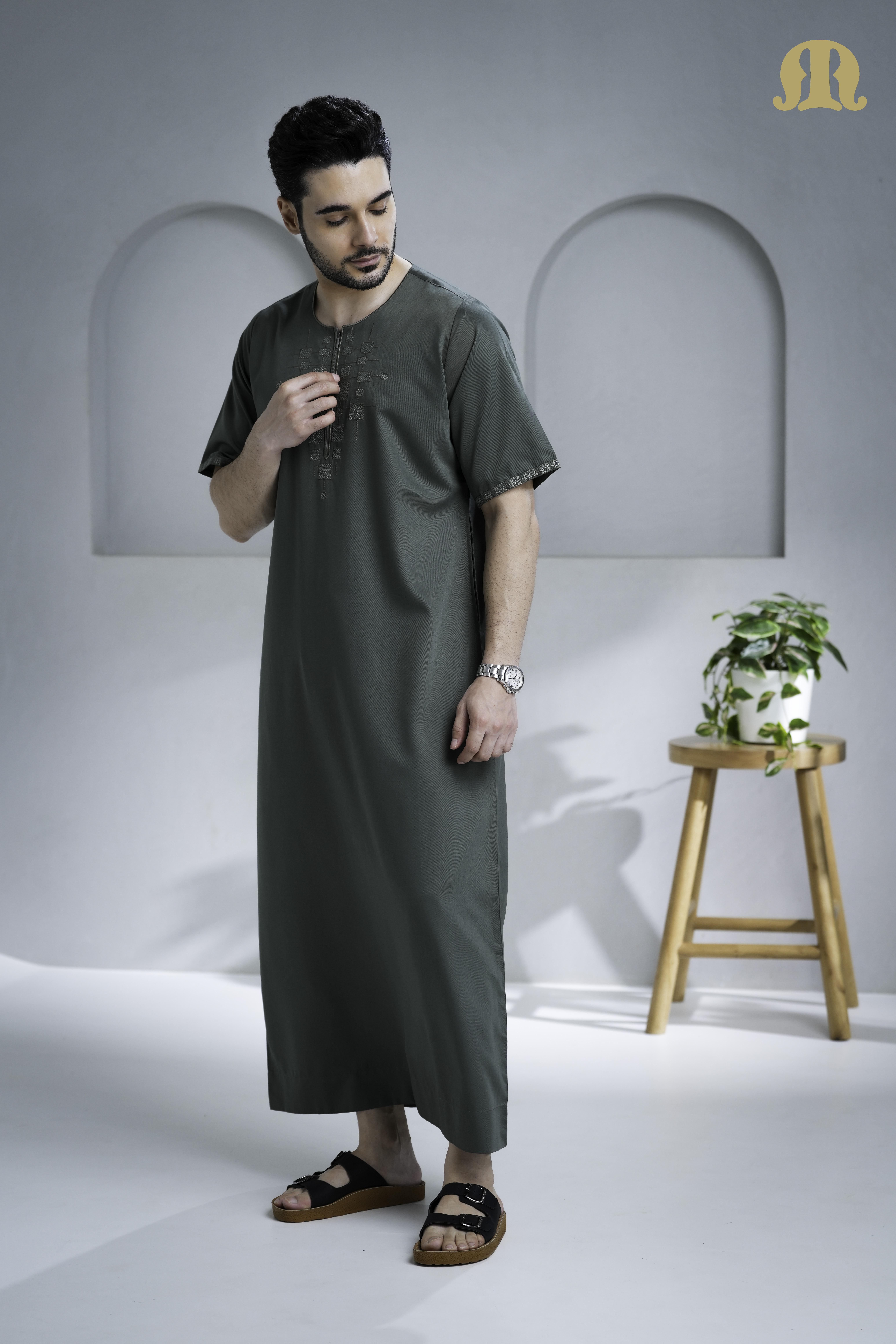 Designed for comfort with refined detailing, this Green Rizbin Half Sleeve Thobe offers a perfect balance of practicality and traditional elegance. Its clean, streamlined silhouette ensures ease of movement, making it ideal for everyday wear in all climates. Crafted from premium Poly Viscose fabric, the thobe combines the breathability of cotton with the durability and wrinkle resistance of polyester. The result is a lightweight, easy-to-maintain garment that stays comfortable and presentable throughout the day. The design is elevated by an embroidered front placket, adding a touch of sophistication, while embroidered sleeves enhance the overall look with subtle craftsmanship. The half sleeves provide a relaxed, contemporary feel without compromising modesty or style.