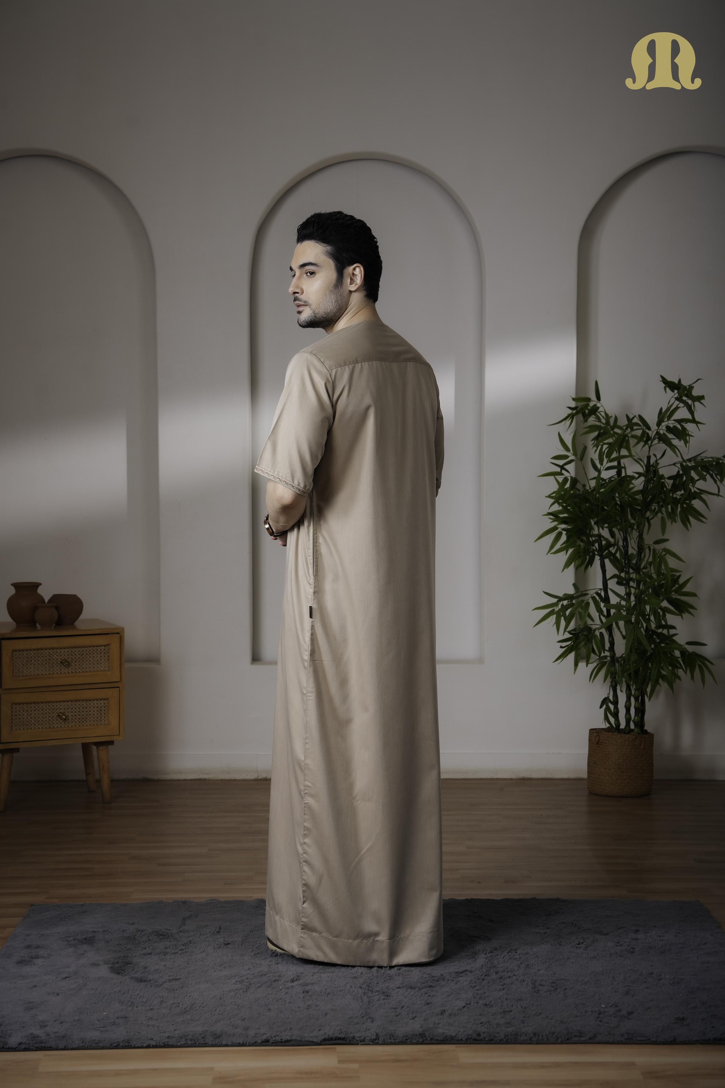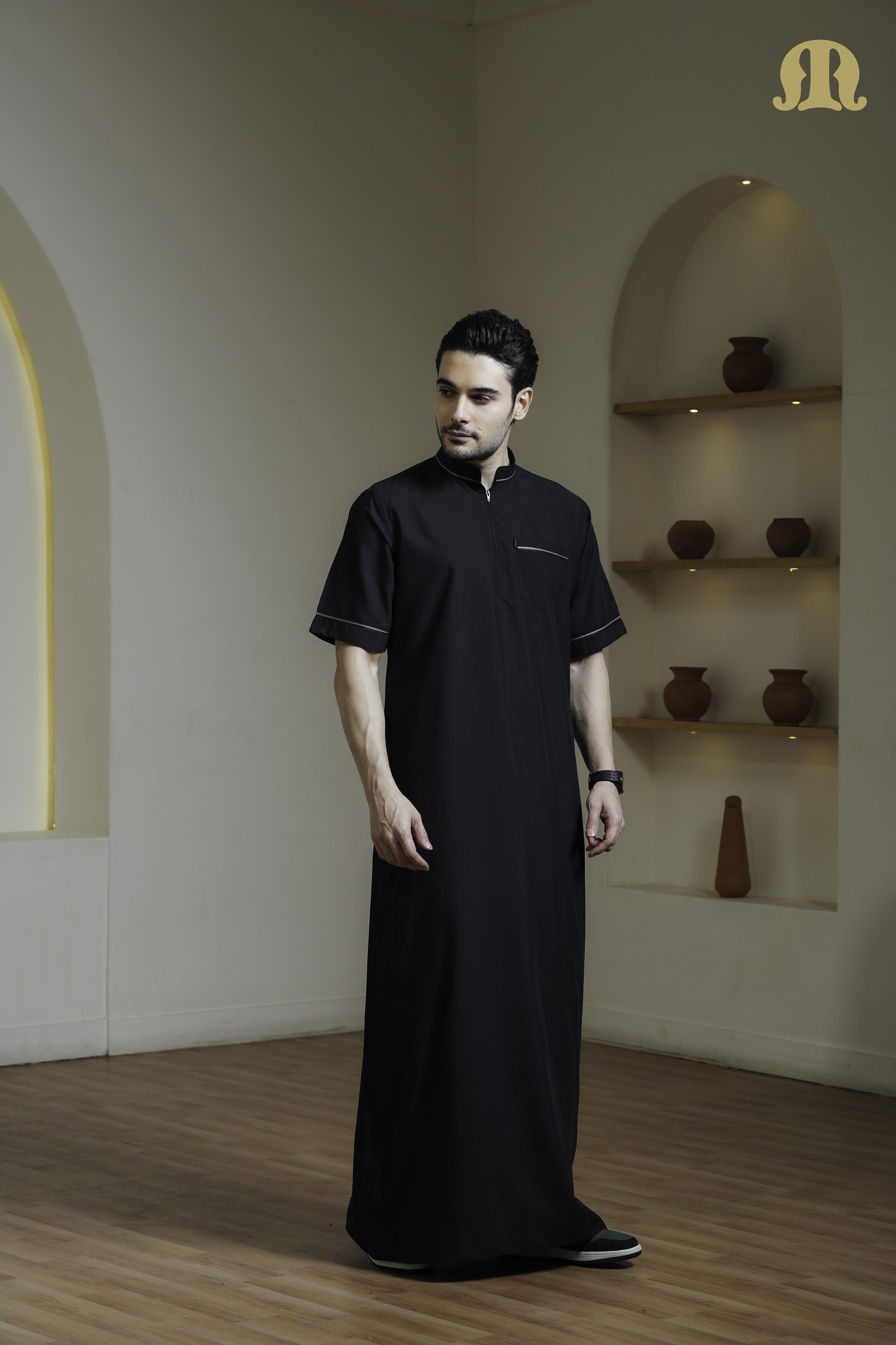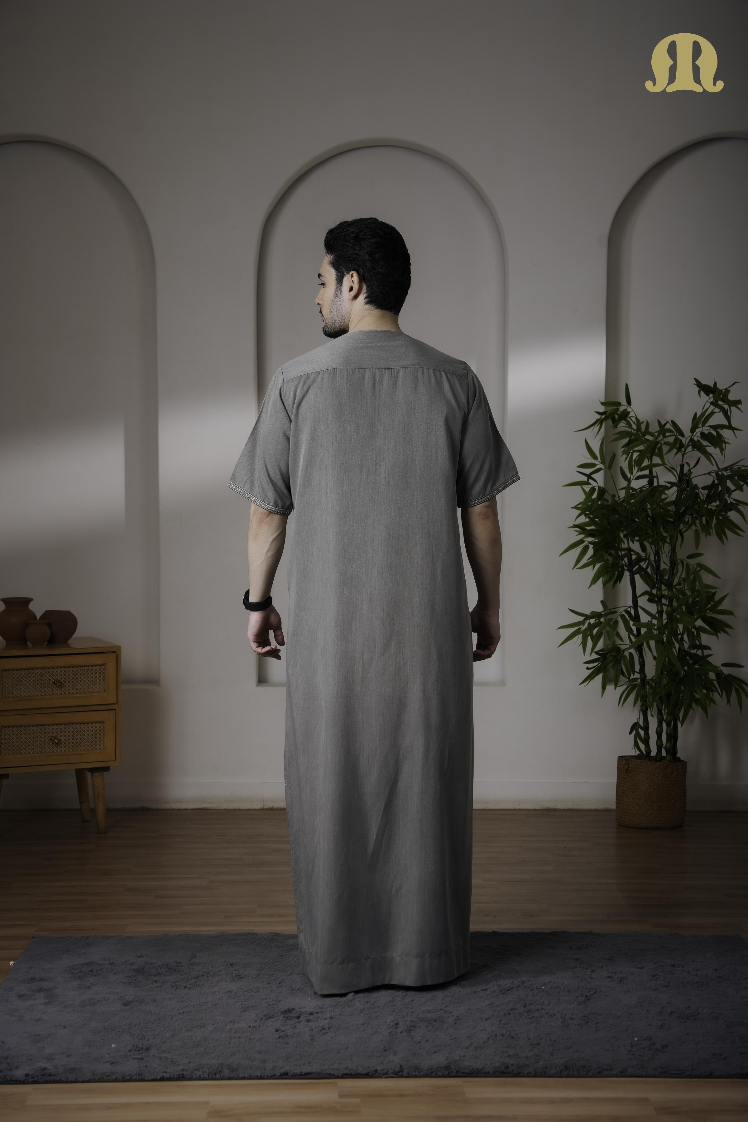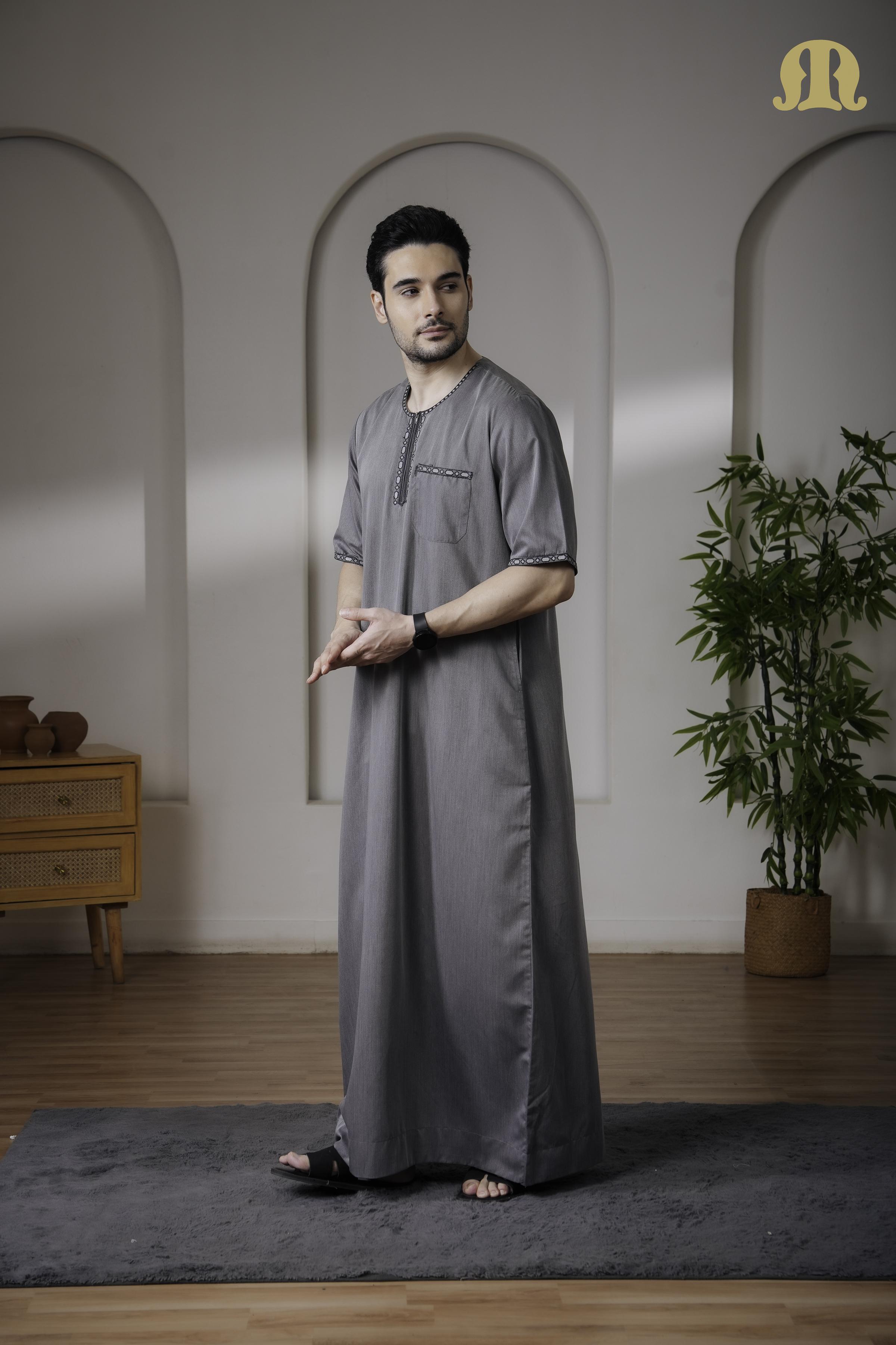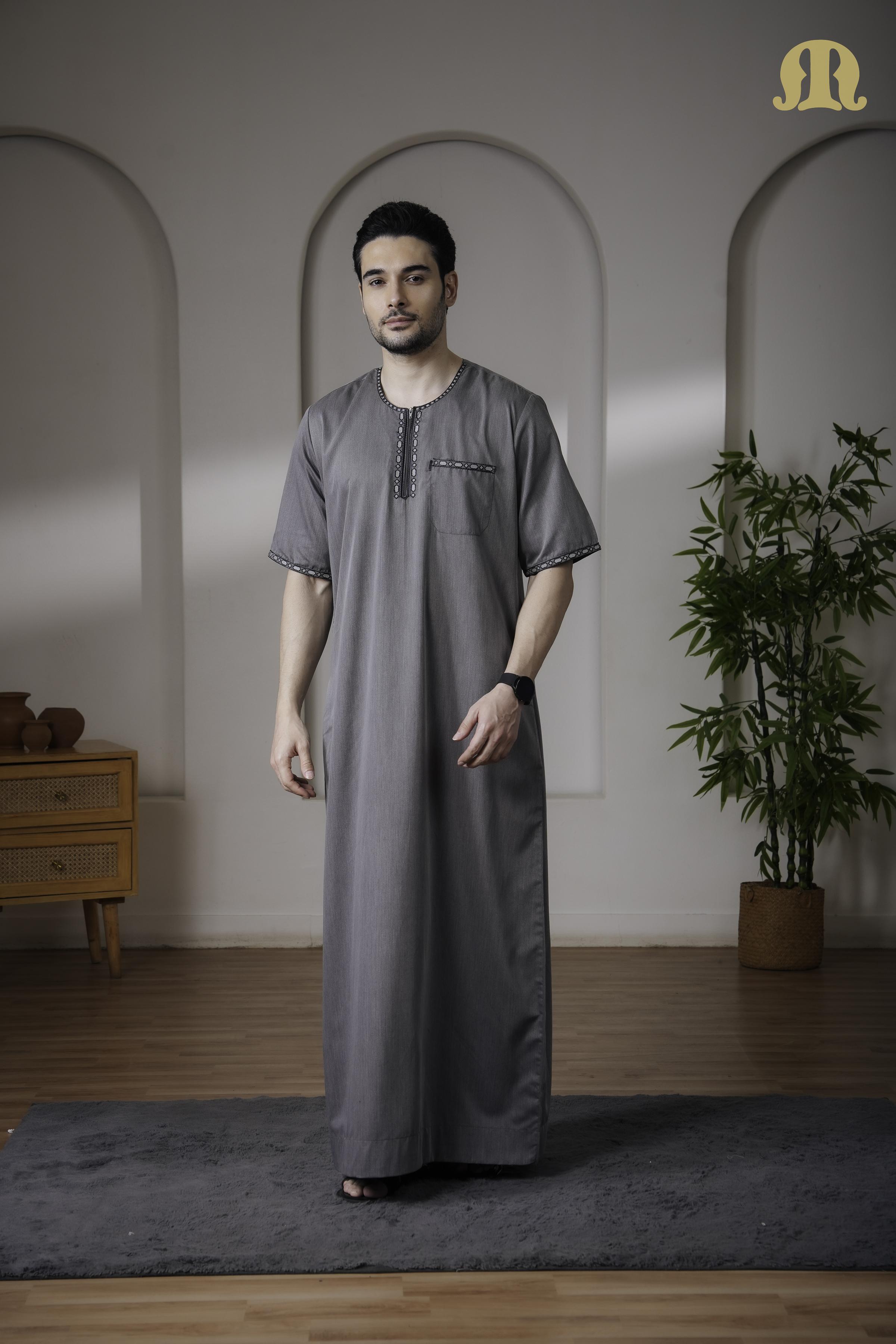 Designed for comfort with refined detailing, this Green Rizbin Half Sleeve Thobe offers a perfect balance of practicality and traditional elegance. Its clean, streamlined silhouette ensures ease of movement, making it ideal for everyday wear in all climates. Crafted from premium Poly Viscose fabric, the thobe combines the breathability of cotton with the durability and wrinkle resistance of polyester. The result is a lightweight, easy-to-maintain garment that stays comfortable and presentable throughout the day. The design is elevated by an embroidered front placket, adding a touch of sophistication, while embroidered sleeves enhance the overall look with subtle craftsmanship. The half sleeves provide a relaxed, contemporary feel without compromising modesty or style.