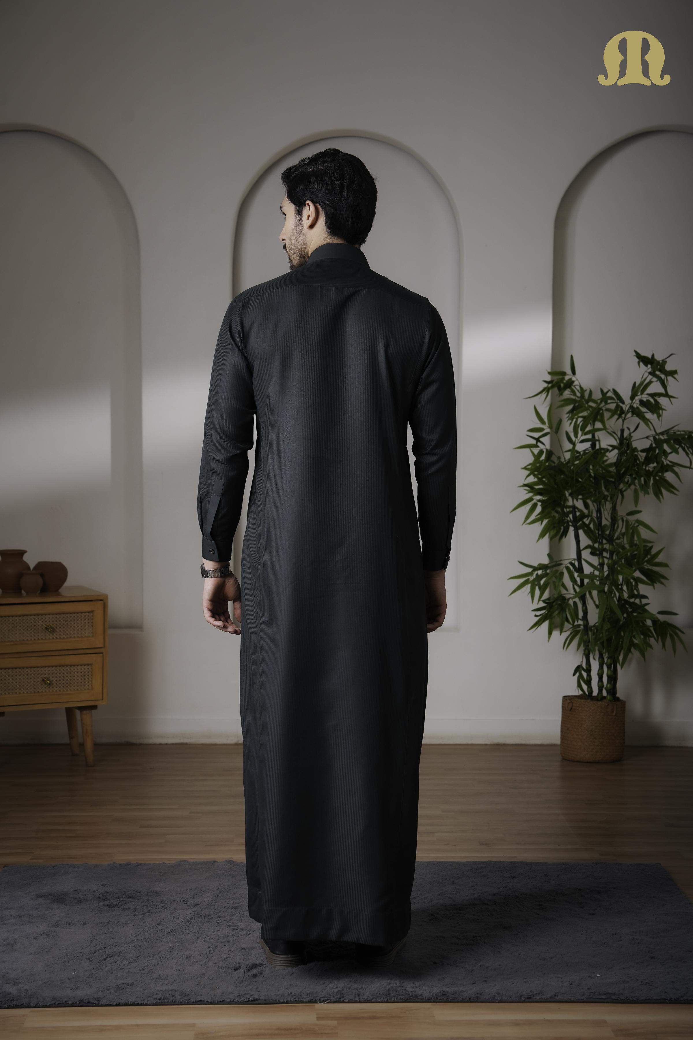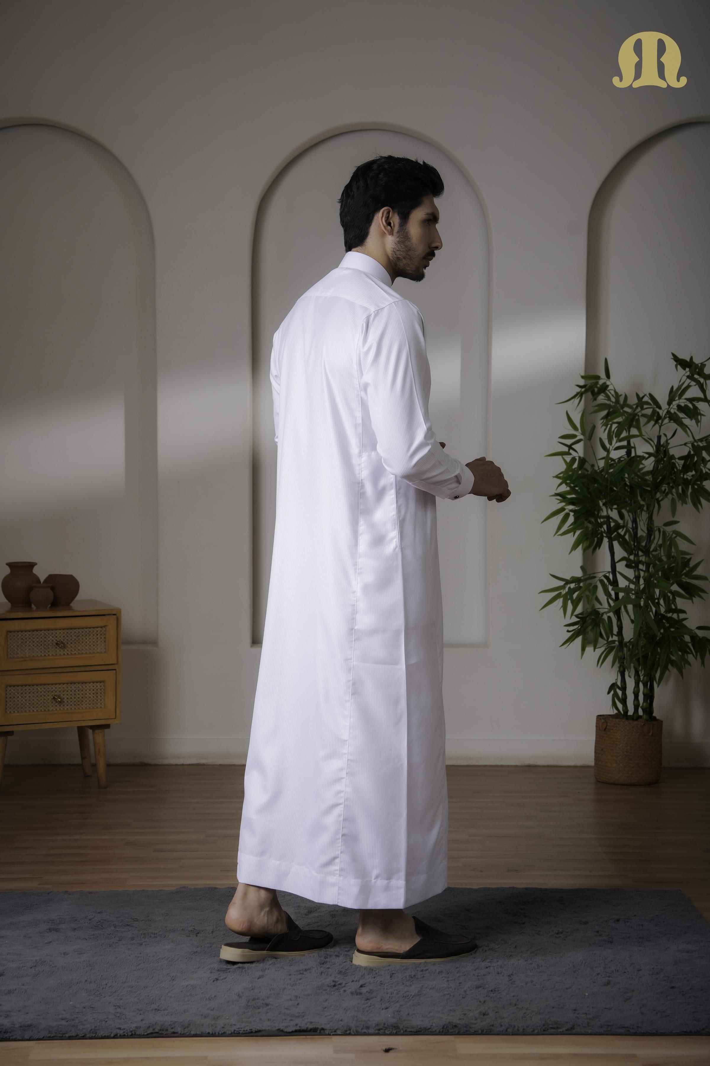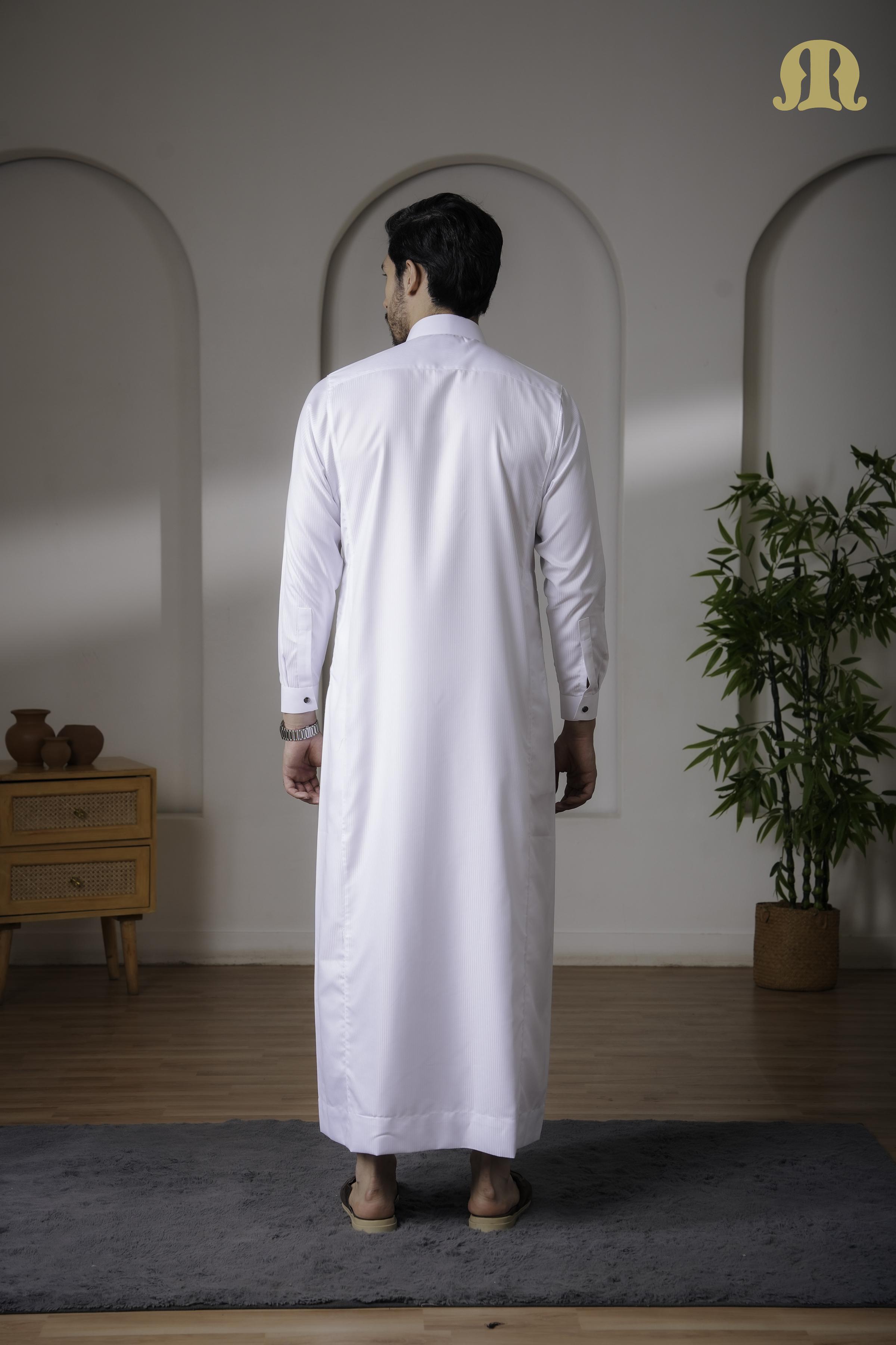 The OZ Striped White Saudi Thobe is crafted from high-quality polycotton fabric, offering the perfect balance of comfort, durability, and breathability. Designed in a classic Saudi silhouette, it features a sleek band collar accented with a metal button, complemented by a refined front placket with metal button detailing for a polished finish. With its elegant striped design and clean tailoring, the OZ Striped Saudi Thobe is ideal for both daily wear and formal occasions, combining traditional style with modern refinement